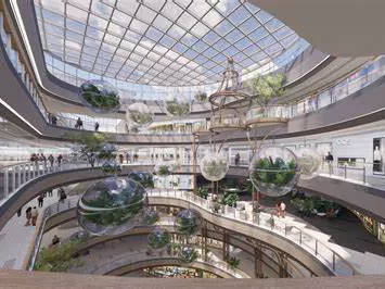 O Centro de Shopping do Jardim Fukaya japonês: apresentando uma estrutura de aço com um design parcial de dois andares, as paredes externas do edifício apresentam uma aparência plissada como o Origami, tornando-o uma característica distinta do shopping center. Sua praça de alimentação está localizada no segundo andar, oferecendo uma vista dupla do shopping e das montanhas distantes.